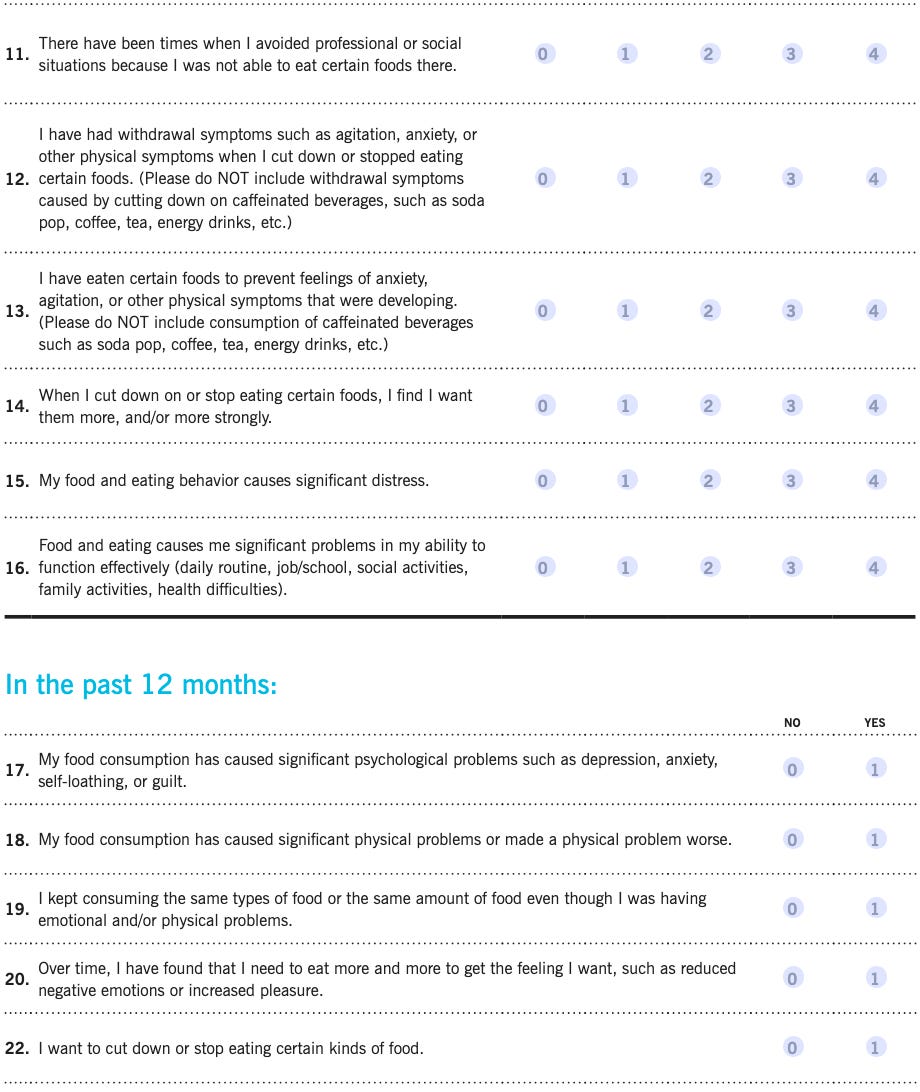 References: Gearhardt, A.N., Corbin, W.R., & Brownell, K.D. (2009). Preliminary validation of the Yale Food Addiction Scale. Appetite.