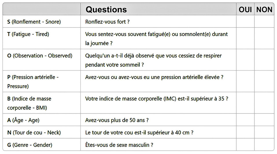 Le questionnaire STOP-BANG, renseigné dans le livre “Votre santé optimisée” (ed. Marabout), est un outil composé de 8 questions permettant d’identifier le syndrome d’apnée obstructive du sommeil (SAOS).